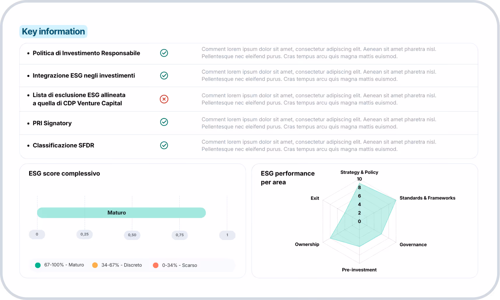 Governa la sostenibilità della tua value chain attraverso una gestione integrata dei fattori ESG. Supportiamo aziende e fondi nel monitoraggio delle performance ambientali, sociali e di governance lungo tutta la filiera, trasformando i dati in strategie concrete. Con Up2You, semplifichi la compliance normativa e crei valore condiviso, garantendo trasparenza e resilienza al tuo business.